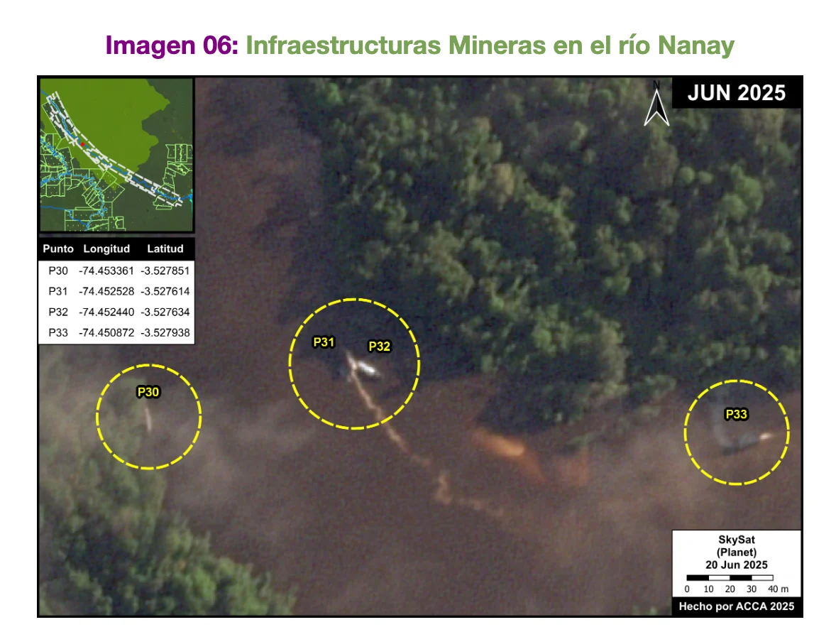 En el caso del río Chambira, se hallaron dos nuevas infraestructuras mineras, incluida una balsa activa. Aunque el número es menor, su presencia revela que la minería se está expandiendo hacia zonas donde antes no se había reportado esta actividad.