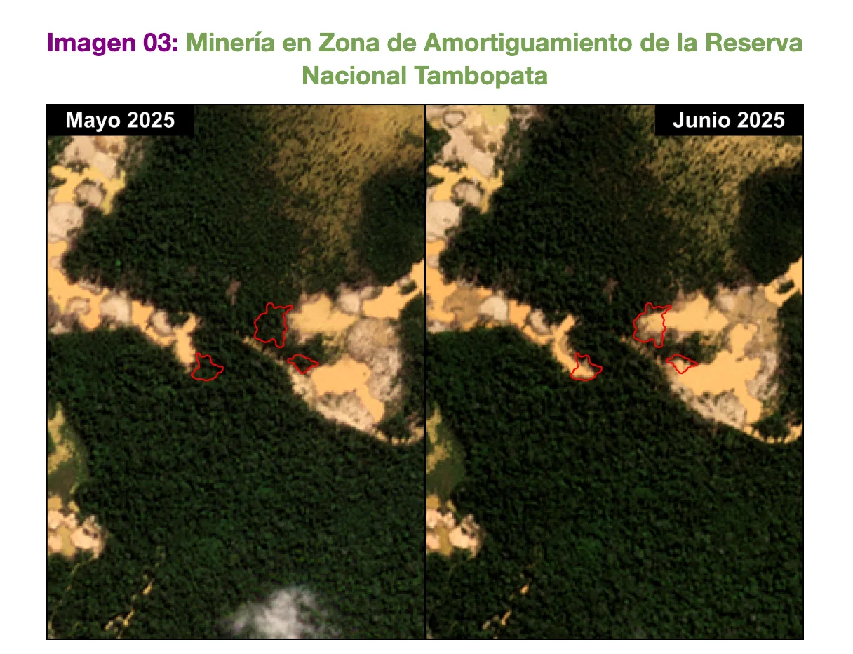 El informe destaca cuatro zonas críticas con actividad minera activa: la Comunidad Nativa Arazaire, la concesión minera Carmen Quispe Sarmiento, la zona de amortiguamiento de la Reserva Nacional Tambopata y una concesión para conservación en manos de la empresa Munay Malquikuna S.R.L. En conjunto, estas áreas registraron más de 250 alertas y una pérdida de al menos 6.91 hectáreas de bosque solo en junio.