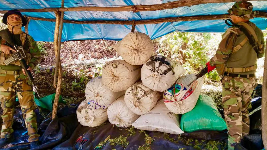 Asimismo, se incautaron 877.9 kilos de marihuana seca almacenada en 77 costales. Esta droga ya procesada estaba lista para su transporte o comercialización. Además de la erradicación e incautación, los agentes destruyeron cinco instalaciones rústicas utilizadas para el procesamiento y acopio del estupefaciente.