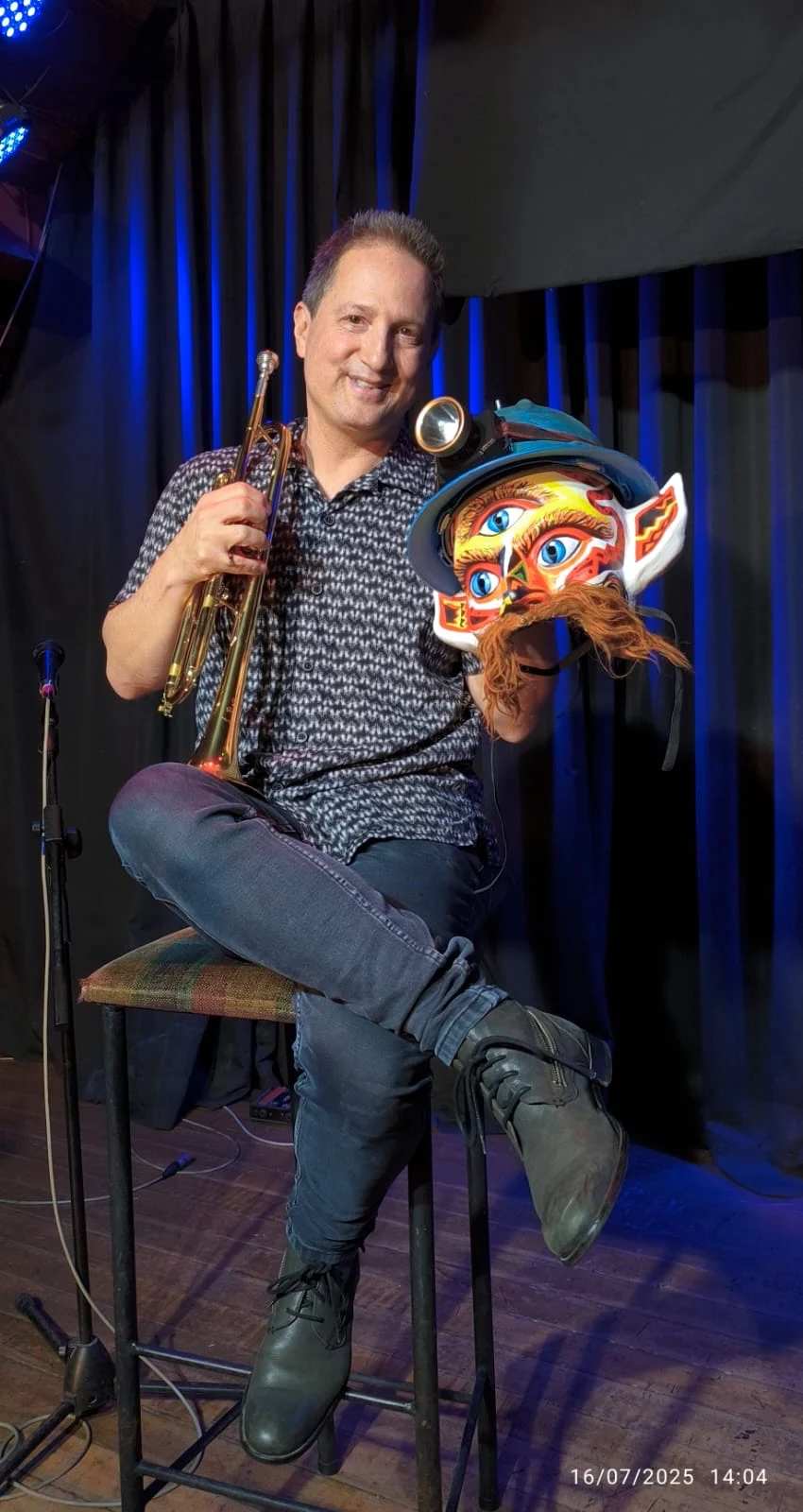 Gabriel Alegría, su trompeta y la máscara del «Muki» mayor. (Foto: Difusión)