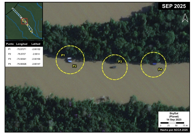 En las imágenes satelitales se identificaron cuatro dragas mineras desplazándose por el río Tigre, en la región Loreto. Estas embarcaciones se encuentran en operación o en movimiento, lo que sugiere una fase de expansión de la minería aurífera hacia territorios antes poco intervenidos.