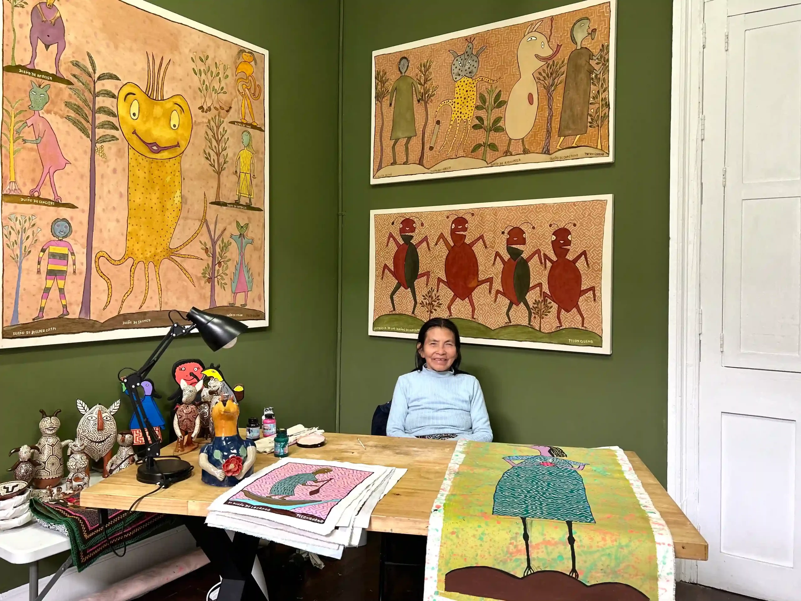“Yo siempre he pintado con tela, y en tiempos de Pablo Macera solo pintaba sobre cartulina y aquí he probado la pintura sobre papel artesanal. También he aprendido a pintar con tinte naturales, creo que ya me voy a olvidar del acrílico”, comenta la artista Lastenia Canayo, quien celebra la oportunidad de seguir aprendiendo e innovando a partir de los saberes ancestrales de su pueblo.